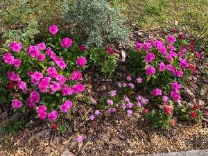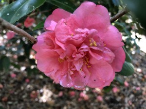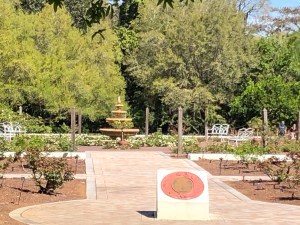 As we continued along, we admired the flowering azaleas, camellias and other colorful blooms. The temperature was comfortable in the low seventies with sunny skies. We peered at the rose garden with a fountain at its center and bypassed the vegetable, herb and butterfly gardens that we’d seen on previous visits.