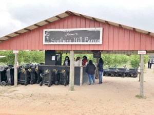 A visit to Southern Hill Farms requires good tires as you have to drive several miles over a bumpy dirt road to get there. It seems like you’re driving in the boonies and heaven forbid you get a flat tire. But other cars are also rumbling along toward this popular location.