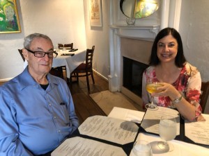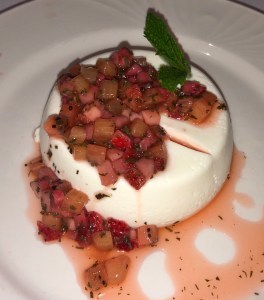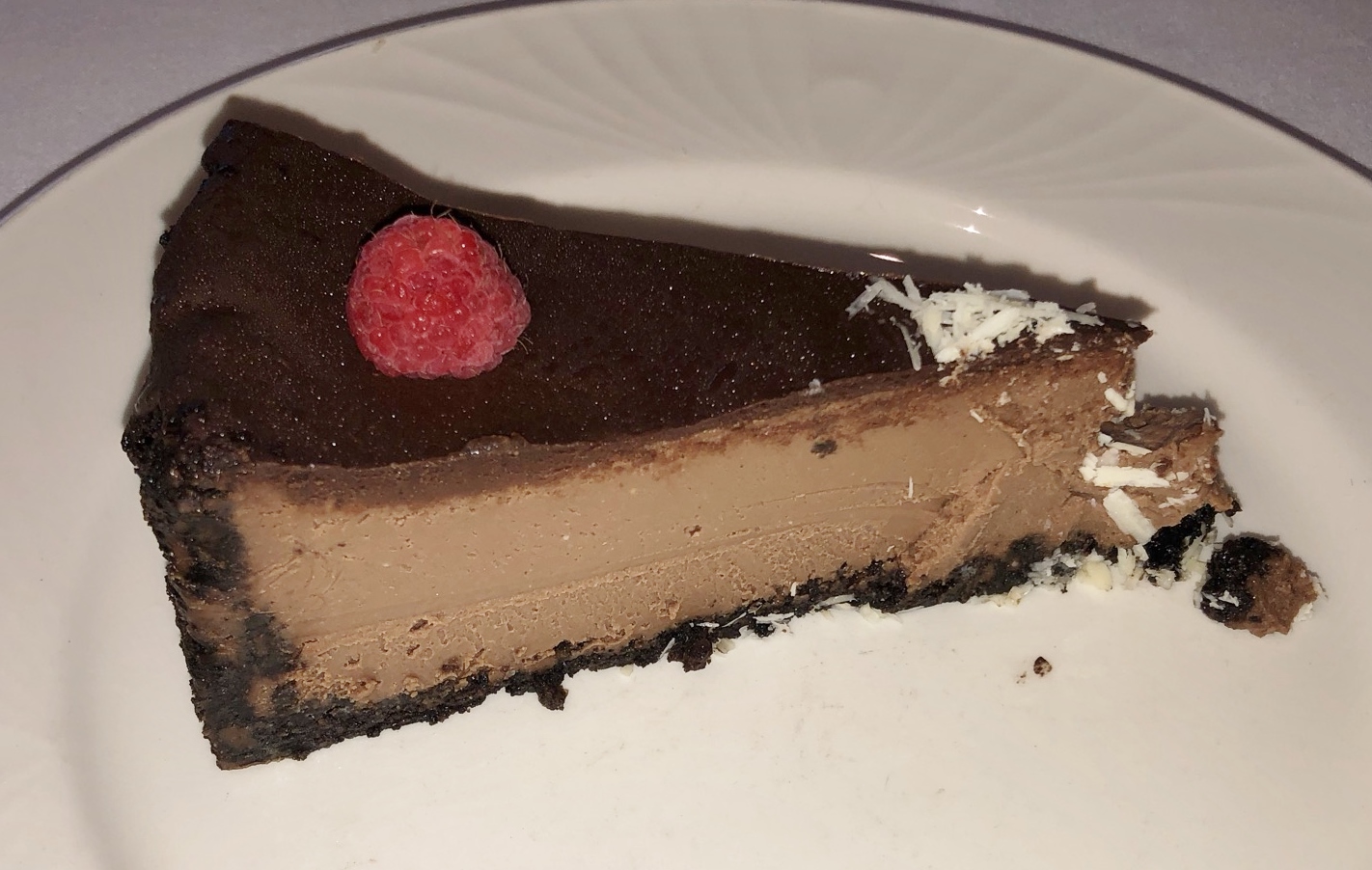 We don’t always get dessert, but since we hadn’t been inside a restaurant for so long, we splurged. I got panna cotta so I could try this light, vanilla flan-type dessert, and Richard got the chocolate Chambord cheesecake. His choice was rich and chocolatey and more strongly flavored than mine.