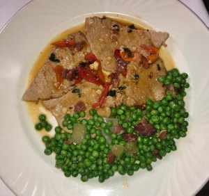Richard had the Scallopine Al Agrodolce. This was veal scallopine slices sautéed in extra virgin olive oil with a prosciutto, garlic and Pinot Grigio sauce. It came with peas. My husband’s only complaint was that for the price ($28.50), he would have liked some potatoes. And peas aren’t too fancy either for an expensive restaurant. I agreed that this selection could have come with better side dishes.