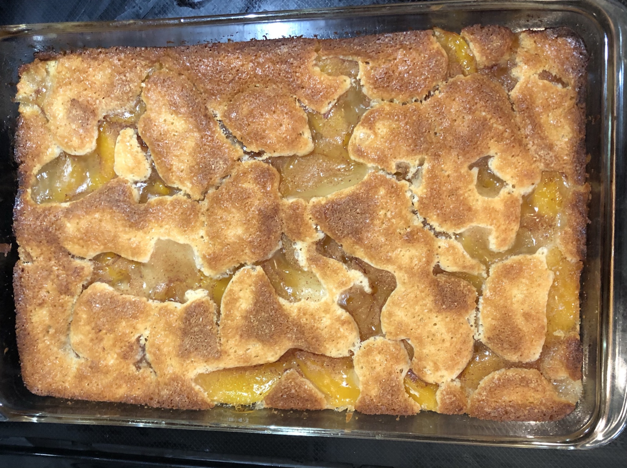 We had the kids over for brunch last weekend. I made this Zucchini Biscuit Bake with the recipe from my cookbook, although I added fresh mushrooms this time. I’d also served a Costco quiche, plus thin bagels with cream cheese. Dessert was peach cobbler.