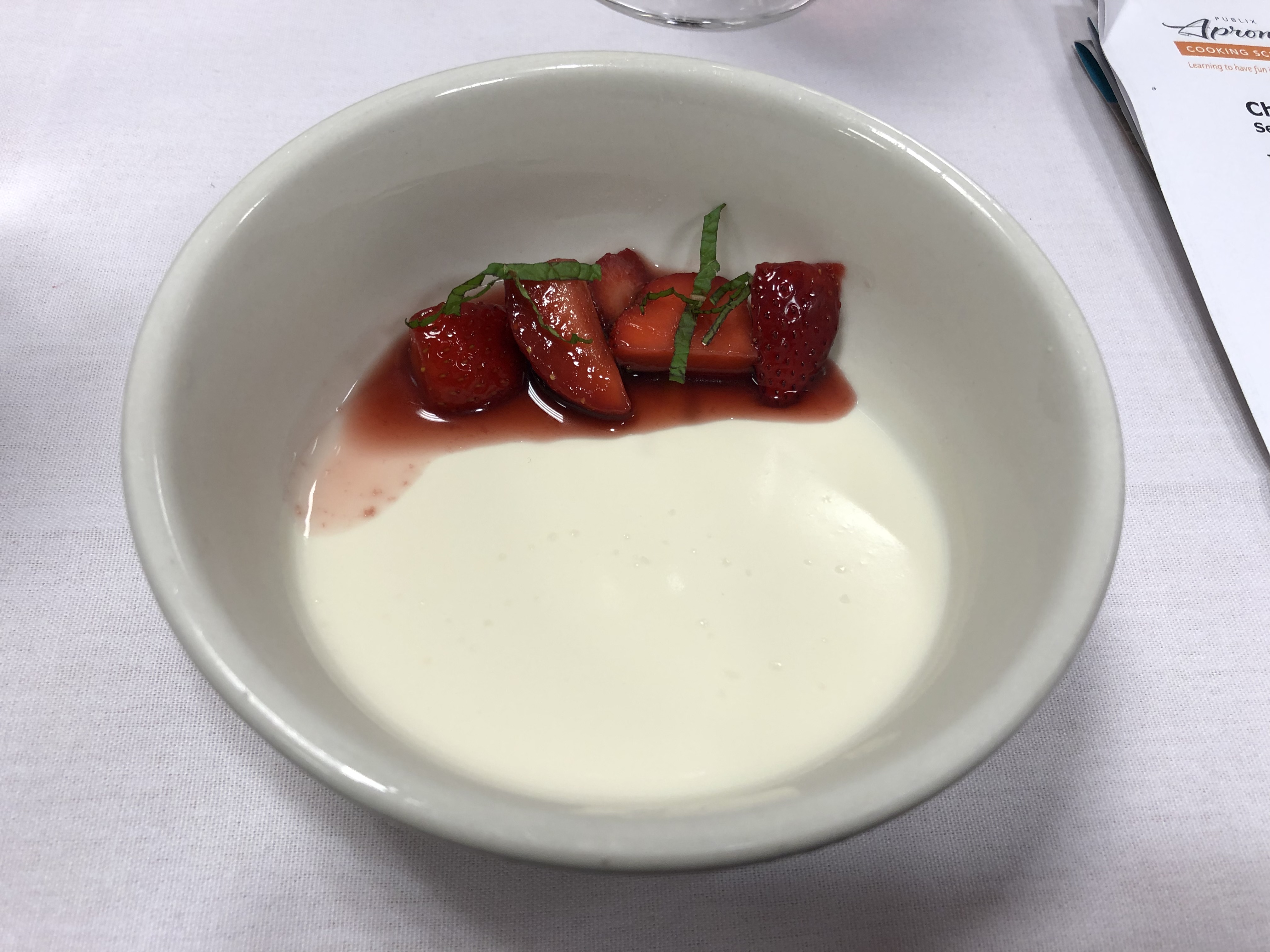 The second course was Roasted Beets with Whipped Goat Cheese and Pistachio Crumble. I could eat this for a meal along with a salad. It was so good. We learned how to clean and trim fresh beets, then coat them with olive oil before wrapping each one in aluminum foil. These are roasted until tender and then peeled. The goat cheese whipped with heavy cream provided a perfect garnish amid a sprinkle of arugula and crushed pistachios. The chefs dribbled honey on top before serving. La Crema Pinot Noir was the wine with this course.