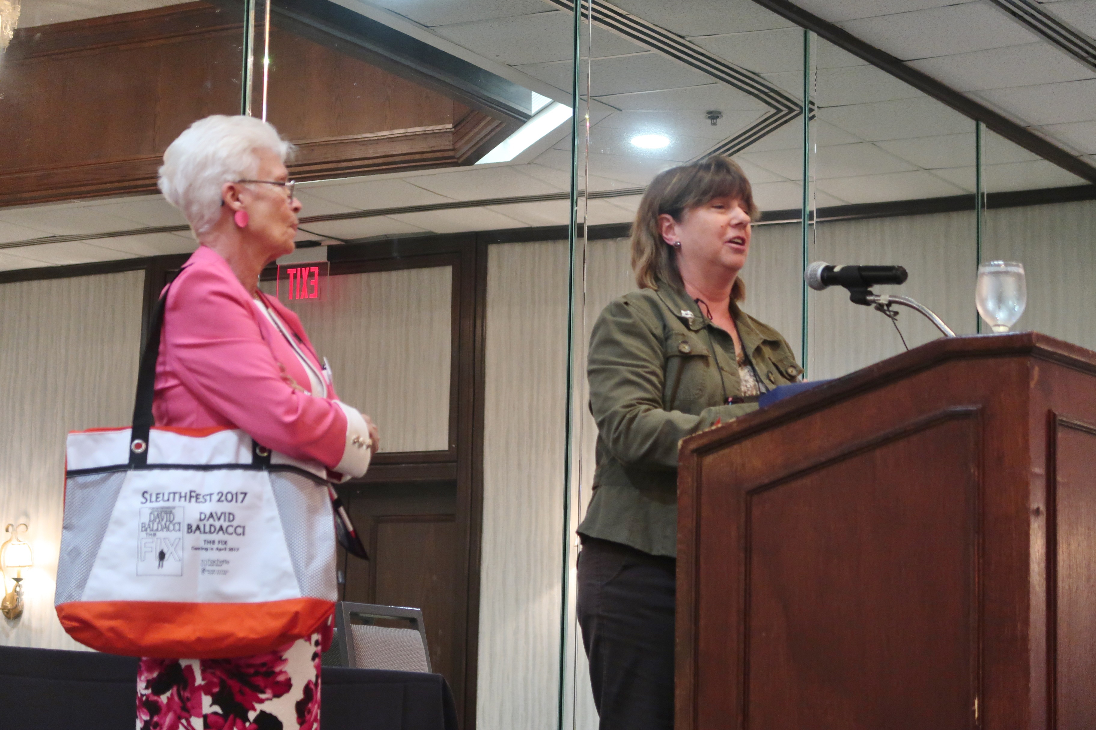 Lunch was a sobering talk by E.J. Wagner on the Evolution of Forensic Sciences. It was fascinating to hear how bodies used to be sold to medical schools in merry old England. Table decorations were lovely, and I was happy again to sit with good friends.