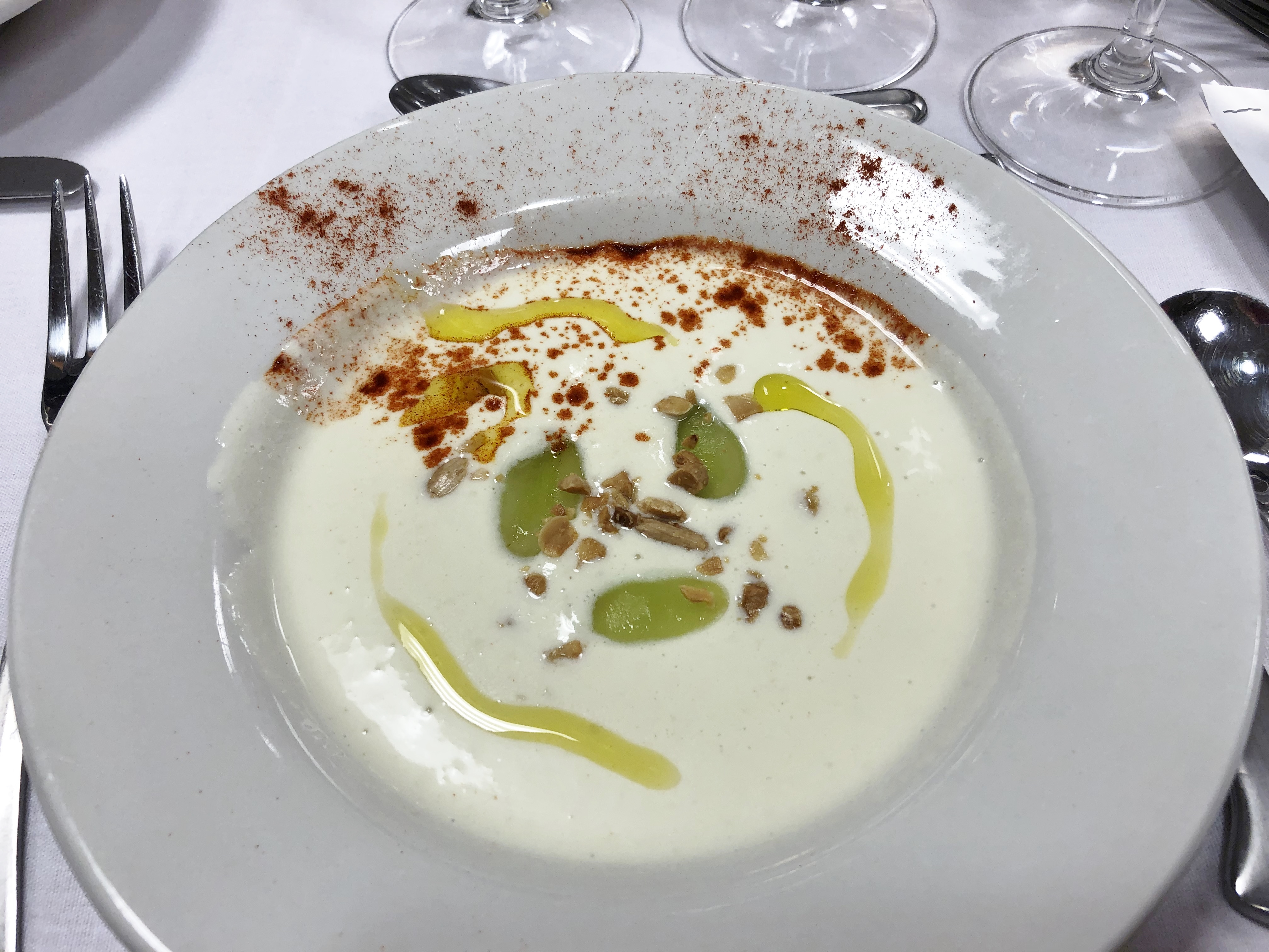 Next came a Chilled Spanish Ajo Verde Soup that was better than I’d expected. Smoked paprika gave this cold soup a bit of a spicy kick. It would be a good menu choice for the summer. Green grapes and English cucumbers provided the green color, while marcona almonds added a touch of crunch. Kim Crawford Sauvignon Blanc was served with this soup.