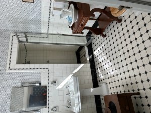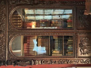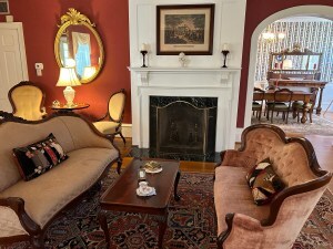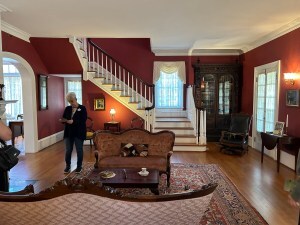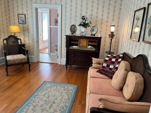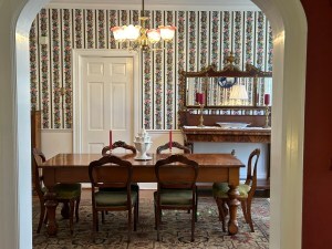 Through the front door, we entered the living room. There’s a pleasant parlor to the left and a dining room straight ahead, with a staircase next to a bookshelf I’d like in my home. Most of these rooms had fireplaces.