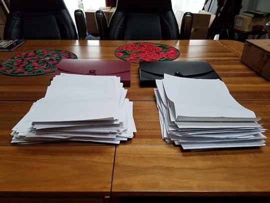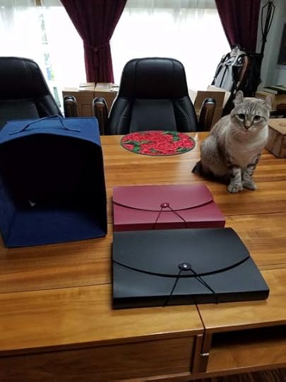 In celebration, and out of duty, I have filed ten years worth of editing and writing contracts… much to the enjoyment and annoyance of my cats. (The red folder is filled with 10 years worth of editing contracts and the black one has 10 years of writing contracts.)