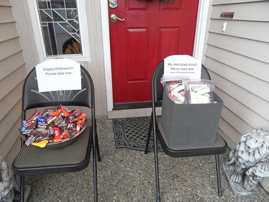 ." This is where, along with candy, you give out a scary book for Halloween. Most years, we are not actually home for Halloween. So, we just set out a big bowl of candy with a sign. It works well. The little kids come early and get candy. The big kids come by and clean out the bowl.