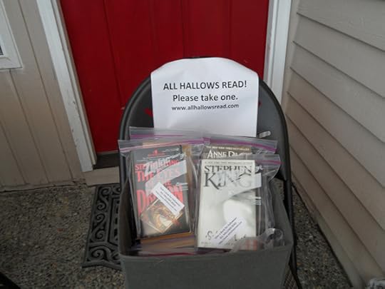 This year, we were home but it's game night… and nothing stops game night short of a missing gamer. So, thanks to a little help from my gaming group, who I told about All Hallows Read, we had a box of books from Stephen King, Dean Koontz, Richard Matheson and John Crichton. The first set was in plastic baggies with a business card sized flyer that included the URL of All Hallows Read.