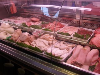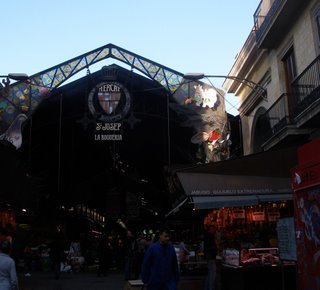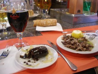 Our first lunch, at the market: morcilla with sweet onions, baby octopi in olive oil, Damm dark beer.