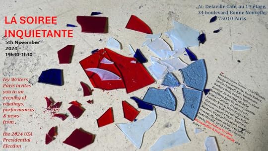 Dear all. I am hosting and reading as part of tonight's 2024 Presidential Election Night in Paris, France, readings, performances and film extract projections with projections on screen of news as it begins to come in from the States. I hope you will join me in supporting democracy and hope, and doing our nail biting together as an international community with Ivy Writers Paris. Here is the information for that: