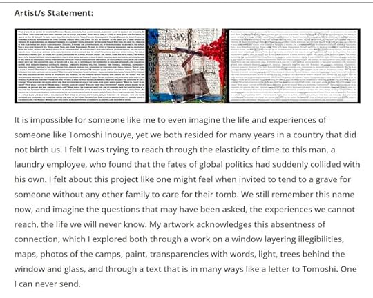 I was supplied with a name, and some background information, then went out and did more research and reflected on the position of someone in my time, and from my background, trying to address a hidden/lost history of the person I was asked to dedicate a work to: Tomashi Inouye. As I wrote in my artist statement, available at the show's website and in the catalogue: