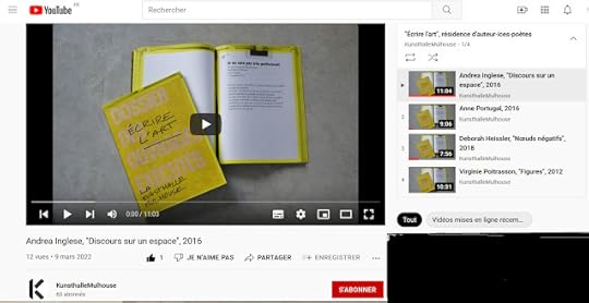 SUMMARY of the book below, in French, which Sandrine Wymann and I assembled and introduced as our "Ecrire l'Art" mini residency series came to a close after its 10 year run. But no worries! As this book arrived in our (your?) hands in Sept 2019 we began our second series: Ecrire l'Art 2--taking a new form of inviting a single author to write during multiple expos over the year. The first publications related to this second Ecrire l'Art will appear this June--with a book by Laura Vasquez and one by Vannina Ma��stri. Our third EA2 resident, Nicolas Tardy, began his visits to Mulhouse this month and will return in the fall to catch the tail end of the next big show at the Kunst.BOOK AVAILABLE: CLICK HERE V��ritable m��moire de dix ann��es d'expositions, ce livre refl��te la cr��ativit�� et la diversit�� d'un lieu ouvert �� de multiples pratiques artistiques. Pendant 10 ann��es, r��pondant �� l'invitation de Jennifer K Dick et Sandrine Wymann, 21 po��tes se sont succ��d�� �� La Kunsthalle. Exposition apr��s exposition, en immersion au c��ur des ��uvres, J��r��me Mauche, Virginie Poitrasson, Fr��d��ric Fort��, V��ronique Pittolo, Jean-Michel Espitallier, Daniel Gustav Cramer, Micha��l Batalla, St��phane Bouquet, C��cile Mainardi, Martin Richet, Eric Such��re, Hyam Yared, Anne Portugal, Andrea Inglese, Christophe Fiat, Dominique Qu��len, Frank Smith, Christophe Manon, Sandra Moussemp��s, Deborah Heissler, Luc B��nazet se sont empar��s de l'invitation et ont compos�� une ��uvre in��dite.