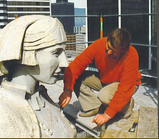 Is the head that is displayed at Cathedral Place terra cotta or fibreglass (we couldn’t tell) and where did it come from? (There were three original nurses that are now at UBC and four fibreglass moulds—three are attached to Cathedral Place and one is at Ital Décor)