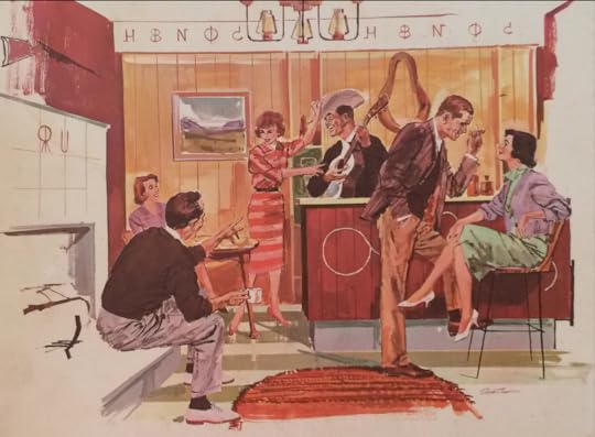 Our hundred-year-old Grandview house also contained a postwar classic—a panelled “rec room” in the basement where the piano lived. They were so popular that Canadian Forest Products’ New Westminster plywood division published a plan book in 1961, offering homeowners six themes to choose from—Contemporary, Western, Polynesian, Tavern, (Artist’s) Salon, and Marine. This was an era of casual entertaining at home, dancing to LPs on the hi-fi or watching TV and drinking. Three of the six plans include a bar.