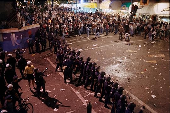 I crammed into a car with dozens of others who were openly drinking and yelling. The mood was intense. When we got out at Granville, the crowd flowed down the street, breaking the windows of the Bay and looting anything they could carry, including headless mannequins. Everyone drifted towards the epicenter at Robson and Burrard. Later, the riot police circled the crowd firing canisters of tear gas, but neglected to leave an escape route. I watched Anne Drennan, the VPD’s media officer tell national television that everything was under control, even as her mascara streamed down her face. It was a colossal fucking mess.