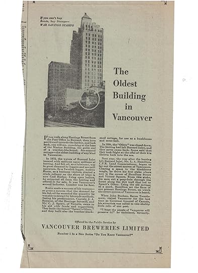 I recently came across this war-time newspaper advertorial by Vancouver Breweries Limited. It shows the same 1935 photo, and circled is “the oldest building in Vancouver.”