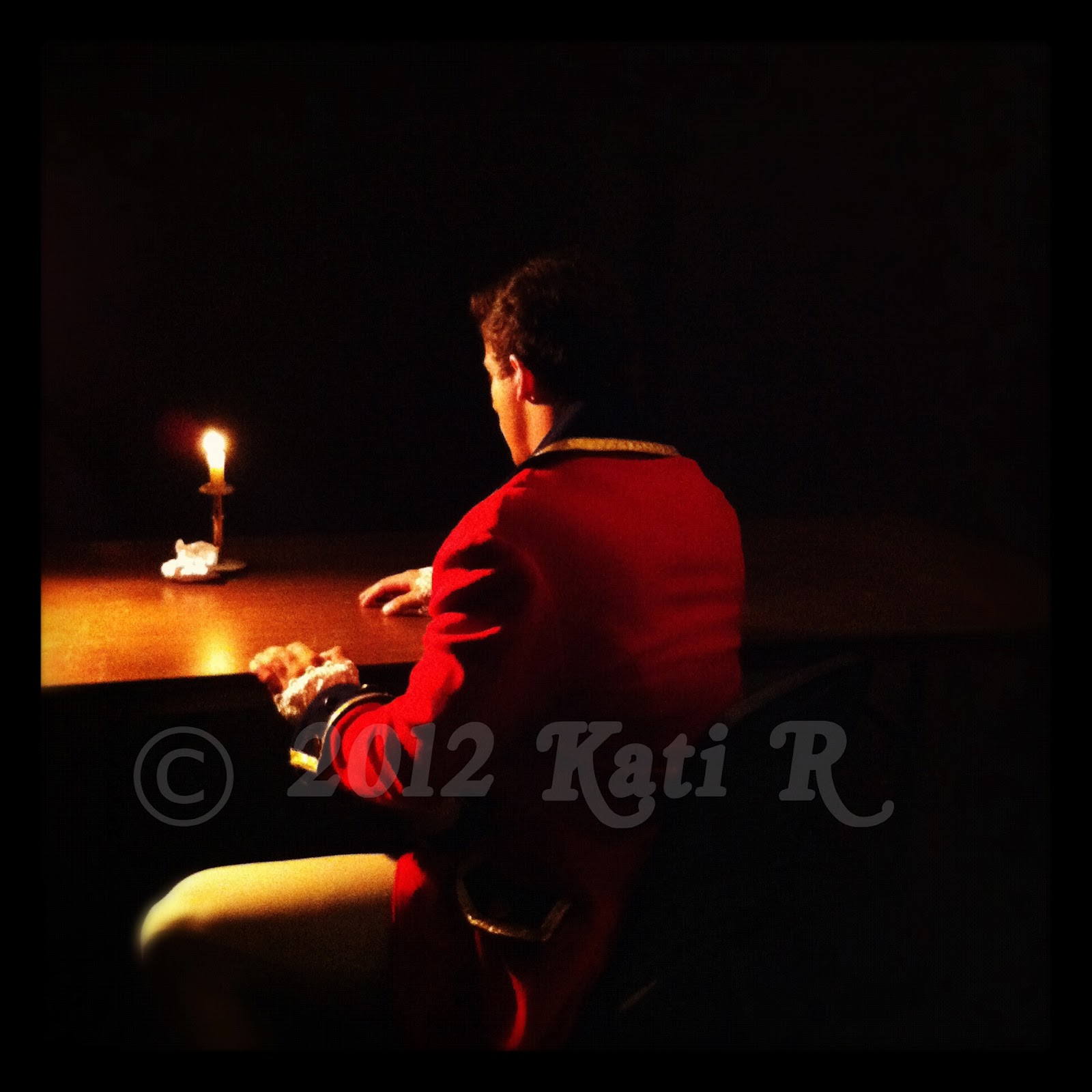 Benjy directed the first scene — a thorough filming of Lord Wentworth’s ass. This involved getting a candle set up, adjusting lighting so that it looked like the scene was lit only by the candle and so on. Then Derek gamely proffered his well-dressed and very firm backside.