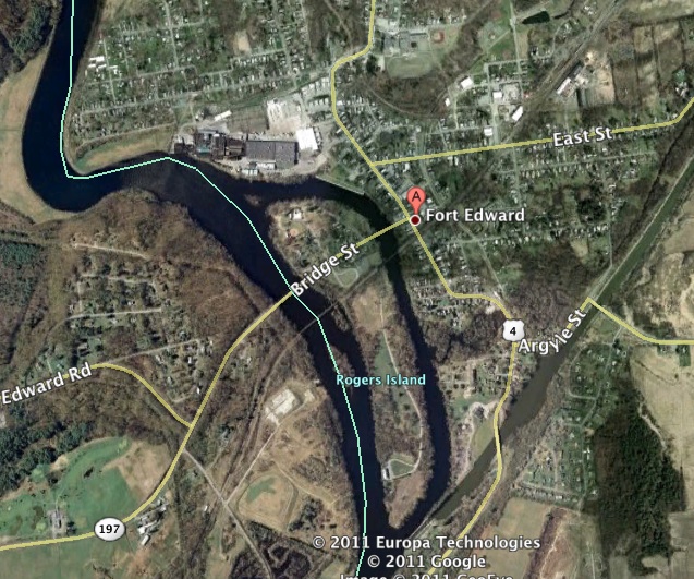 At top, you get a good overview of Ranger Island/Rogers Island. It sits in the middle of the Hudson River near the Great Carrying Place where Native people had to get out of their canoes and portage for a time. Fort Edward stood to the right of Rogers Island. The whole area is now the town of Fort Edward, but the fort itself stood not where the red dot is, but more where Highway 4 jogs to the right across from the island.