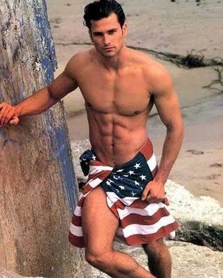 Umm, yeah, that's a teeny tiny flag bathing suit, and the only thing I have to say is that the designer of this piece of patriotic clothing is a genius. GENIUS! From his beautiful man chest, to his drool worthy thighs this particular flag is well represented :)