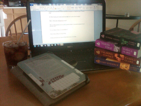 The photo at the top was taken by Kristin of her study arrangement when she sat down to take on the I-Team Trivia. She did very well, by the way. I just love it! She's got the books, the e-books, caffeine, and her laptop. She is ready to go. I asked her for the photo and meant to share it when I announced the answers. #BrainFail.