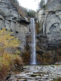 Yesterday, we hiked up to Taughannock Falls in the pouring rain without umbrellas — Colorado people don't own umbrellas — and got thoroughly soaked. It was really quite the site. Higher than Niagara Falls, it spills down a sheer wall of shale to a riverbed that is polished smooth down to the rock in some places. Really very interesting geologically speaking and breathtaking visually. The water flow was much higher than you see in this photo. The runoff was a big ribbon of white that filled the spillway.