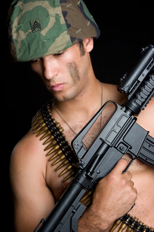 I'm not sure which branch of the service this excellent specimen of military manhood represents. But I do see that he is reading. I hope it was an enjoyable read and that he's safely back in the United States now. He has clearly served his country in two important ways: 1) serving in a war zone and 2) allowing this scrumptious photo to be taken. Very nice pecs and shoulders.