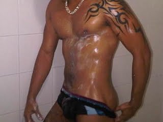 This gentleman has it all going on — rock hard body, tribal tat, wet skin. He reminds me of the Coppertone advertisement, except that instead of a dog pulling the little girl's bathing suit down, it's him pulling his own bathing suit down.Well, don't stop on our account, sweetheart.