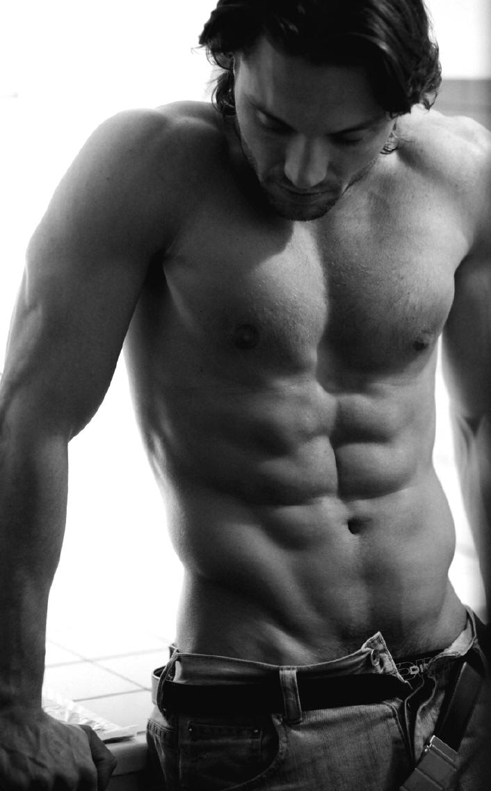 Here's a sexy gentleman. I had to crop it because the original photo shows everything. And every inch of him is as luscious as what you're seeing here. This guy is pretty much perfect in my book — masculine with defined muscles and the purrfect amount of chest hair. He looks like he could be a real man and not someone who spends his life in the gym.Follow that groove in his abdomen down to that thatch of dark hair... Yes, that's what I had to cut out. You can see, however, that I did let the view go as far south as I safely could.