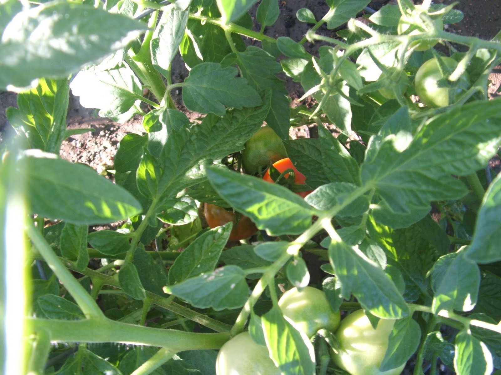 See that little peek of red amid the green vines? That's our first ripe tomato of the season.