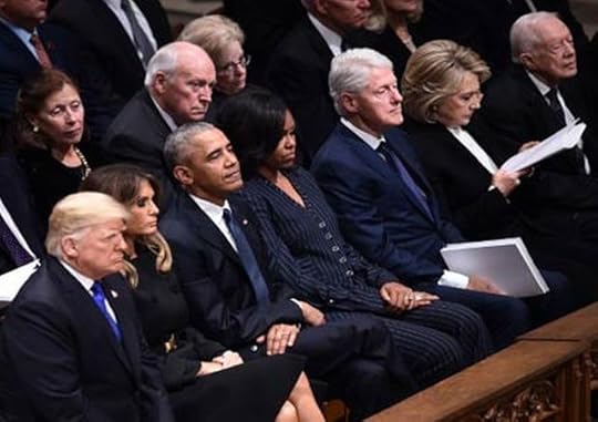 The current president (scowling) and other recent presidents at the George W. Bush funeral.
