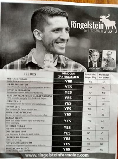 Will Ringelstein win? The pundits would say, “no.” But in Maine, a state on the cutting edge of electoral politics given that we now have Instant Run-off Voting (IRV), it’s now possible for candidates like Ringelstein to have a chance against well-funded incumbents. And like Ocasio-Cortez, he’s received nearly nothing from the state’s party machine.