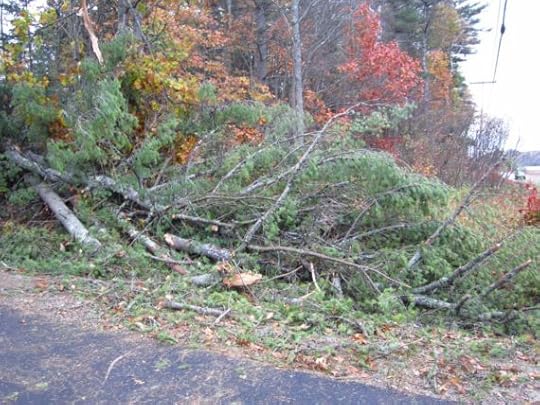 Monday morning, Mary and I walked to the end of our street that abuts Route 24/Harpswell Road. She wanted to see if she could get out and head into Portland to work. We didn’t have power, everything was in the able hands of master freelance writer and jack-of-all trades, Mr. B, so why not? One problem. There was a tree down that prevented a vehicle exiting the neighborhood.