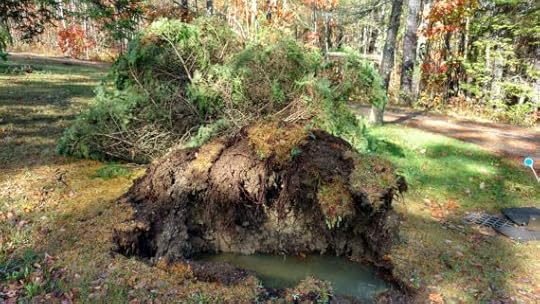 Once we were up, we went out and surveyed the damage more closely. I pulled the top of one of the two spruce trees in front of the house that had snapped off. The other one got uprooted and was lying on its sided across the front lawn. Our circular driveway was partially blocked, but we could get out to Leeward Cove Road and also Route 24. A large tree had come down where those two intersect, but there was room for a car to pass.