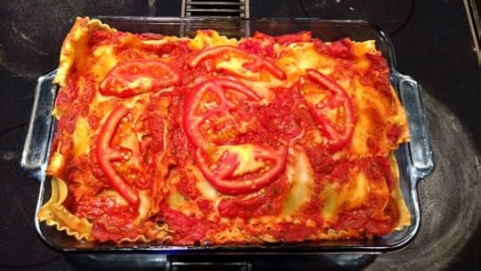Back in our meat-eating days, this might be a sausage lasagna. Even then, I’d made tofu-based lasagna before. However, vegetarian lasagna, filled with ricotta cheese and topped with mozzarella is an entirely different product than a lasagna sans dairy.