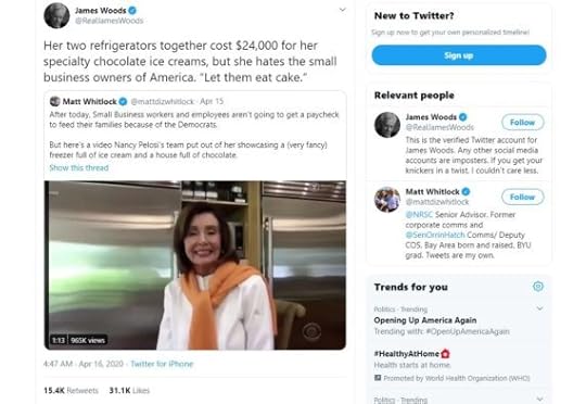 Enough of the old white guys. An old white gal, Nancy Pelosi, seems to think it’s okay to show-off two refrigerators that cost slightly less than I’ll make in my primary job this year, stocked full of bougie ice cream. Can you say, “tone deaf”?