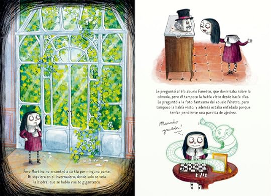 En este segundo libro de las aventuras de Mortina, la niña zombie, editado por La Galera conocemos a más miembros de su familia. Aparte de Mustio, su galgo, la tía Angustias y los demás fantasmas que viven en Vila Decadente, aparece su primo lejano y un nuevo misterio. En la literatura infantil y juvenil de nuestros días encontramos un montón de niños semimonstruos: Mirabella, Isadora Moon, Amanda Fang, etc. Mortina es una niña zombi, algo pálida, pero igual que cualquier otra niña de su edad. Le gusta jugar y divertirse con sus amigos humanos.