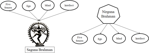 The idea of a personal god [Saguna Brahman] with attributes is ultimately an illusion, since Brahman is not limited by attributes. Such a being plays a role for those “still enmeshed in the cosmic illusion of maya.” In other words the notion of a personal god [who you can talk to and listen to] helps most people begin to leave behind the attachments of this world. But ultimately [Nirguna] Brahman is transpersonal, and without attributes. [Some philosopher said he preferred the personal god because the impersonal god seemed like a bowl of tapioca pudding.]