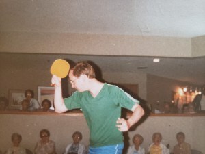 Yes, that’s me in the picture above. I’m in my early 30s and my dad asked if I would do a table tennis exhibition in his retirement home with my friend George Hendry. What I remember most was that the table was on a carpet—a no-no in table tennis as the bounce becomes unpredictable—and the lighting consisted of a few lamps far away from the table—you could hardly see the ball. My dad was the mc. I hope he enjoyed it.