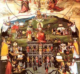 Wrisberg epitaph in Hildesheim Cathedral, showing the distribution of the divine graces by means of the church and the sacraments, or mysteries. By Johannes Hopffe 1585.