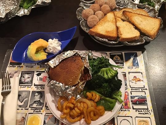 Sometimes I think I’m wasted as a novelist: I could maybe do theme meals full-time. For small children. It’s sort of a niche market. But below is our dinner before going to see The Wizard of Oz at our local theater. We’ve got Tin Manwiches, Emerald veggies, potato tornados, Over the Rainbow Sherbet, Toto-Toast with Jelly, and Munchkins from Dunkin’ Donuts. (My son came up with those last two. I am training him well in the art of amusing food.)