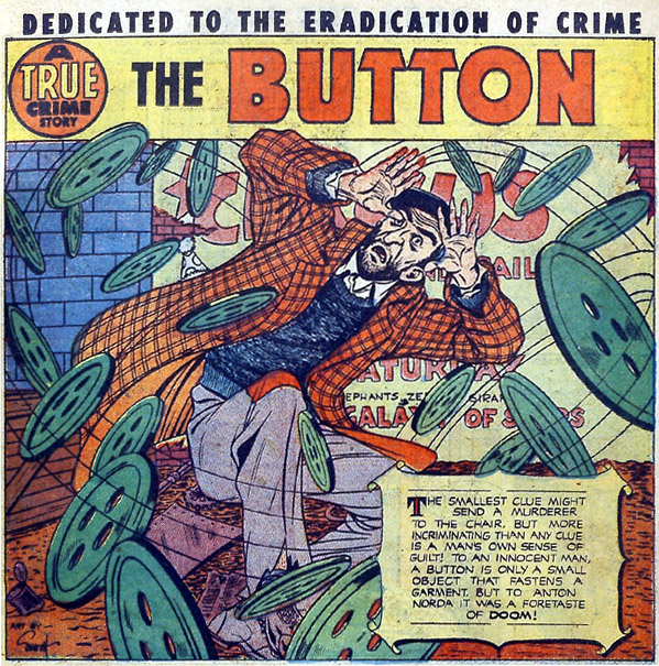 Everett reestablished his connection with Steve Douglas, editor at Eastern Color, and did a number of adventure and romance stories in books like Heroic Comics and Personal Love. But any 1950 Lev Gleason connection was unknown until I received an email from Mr. Monster creator, Michael T. Gilbert who sent me scans of "The Button" from Crime and Punishment #31, cover-dated October 1950. (Click on the above image to see the signed splash panel.)