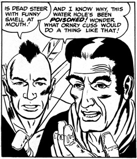 The genesis of Nick's post is that one can tell in the word balloons that another name for the character was erased and the Utah Kid was placed in its stead. Here's the published version from the original comic (buy the digital version and see how well Fantagraphics cleans up the source material for the Steve Ditko Archives series!) beside the original B&W version (followed by the splash page panel containing the balloon - click on all the images to see larger versions)...
