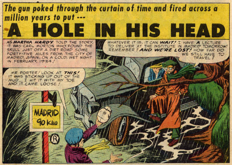 But the most fun comes from the last page of the story. Spoilers: These three characters find a skull with a hole in its seemingly-neanderthal head. They then get into a fight over the woman, fall into a pit, which takes them back into time where one of the men shoot the neanderthal in the head, and they all go crazy realizing the paradox. Only the woman escapes with her life, leading to the last two panels in the story...except that in the printed version, there is no last panel...