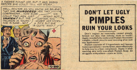 Clearly, Simon/Kirby thought the presentation of the last panel was so weak that they were willing to toss the "twist ending" and just leave it at the woman as having gone insane. (Wonder how much money they made, if any, off of the placement of that pimple ad? Probably seemed like a good trade at the time. They most definitely didn't think some Canadian and a New Yorker would be examining this stuff 60 years later!)