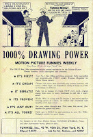 Motion PictureFunnies Weekly #1 had a color cover, but the interior was B&W, and ledoff with Everett's Sub-Mariner origin story. Click HEREto view scans of the entire issue (thanks to author Sean Howe for the link), including the back cover drawn by Everett promoting Funnies Inc.'s desire to encourage similar business for the shop.Read through the message board thread and you'll learn a lot about the historyof this key comic book (which we discuss in great length in my Fire & WaterBill Everett biography). When the story was "reprinted" in Marvel Comics #1, Everett expanded it by four pages (the originalart to page 12 is featured in the Everett Archives v1) and attempted a coloringprocess that, in print, didn't yield the desired results. Seeing the story inB&W only highlights Everett's place in the absolute top tier of creators duringthe Golden Age of Comics. (Creators, notjust pencilers, since Everett was a five-tool player, to use a baseball analogy).
