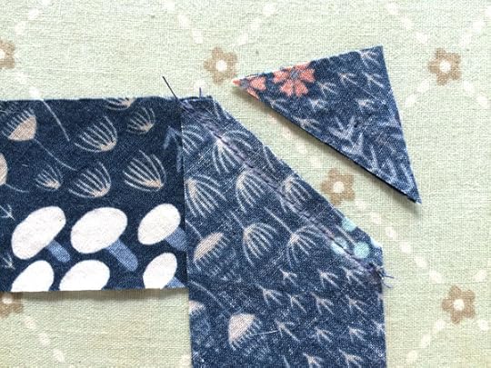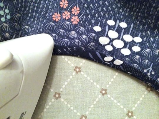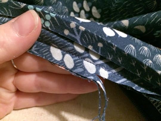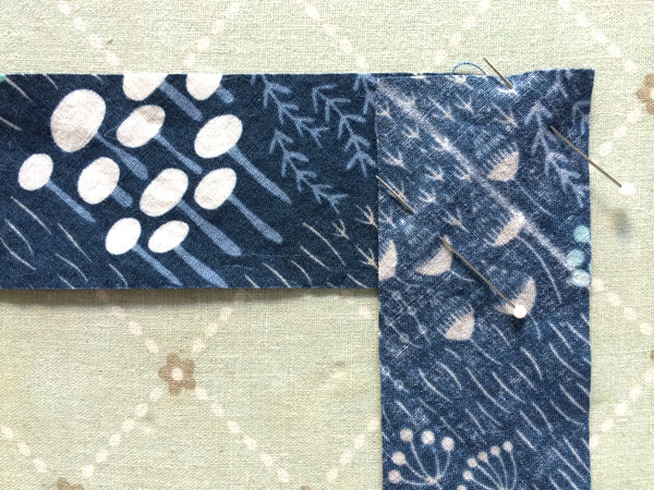 Step 1: Cut strips of fabric on the bias. If you can get one strip to go all the way around the neckline (with some overhang) then you will only need one piece. I had barely enough of the Wildwood fabric to make bias at all, so I had to piece it in multiple chunks. It doesn't matter though since the binding ends up on the inside so all the joined seams will be hidden from view. I cut my binding 1.5" wide and then line them up to form a right angle, right sides together, with the top and right sides flush. Pin together and draw a line from the upper left corner to the lower right corner.