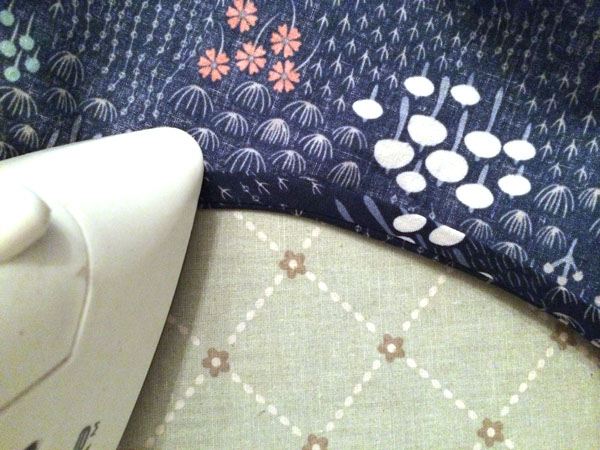 Step 8: On the right side of the fabric, press the seam open, pressing the bias binding up away from the dress. The seam allowance on the inside should also be pressed up at the same time underneath the seam.