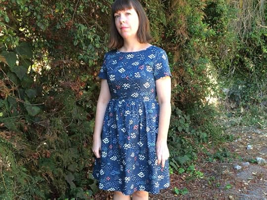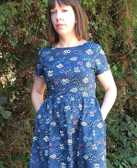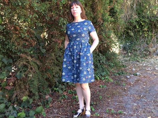 But let's talk about today's dress. This is my Emery Dress in gorgeous organic quilt weight cotton from Cloud9 Fabrics with the most adorable print by surface designer Elizabeth Olwen. I have been following Elizabeth's Instagram feed for a while now, totally in awe of her cute prints on every surface you can think of. Suffice it to say, when Cloud9 contacted me to see if I wanted some of her fabric to make something with, the answer was a very quick yes!