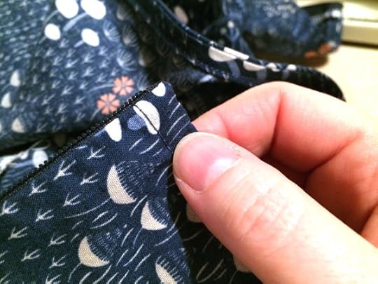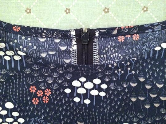 The right side of the zipper should look like the above photo, with the teeth facing out toward the center back seam and the top all tucked into the wrong side of the center back.