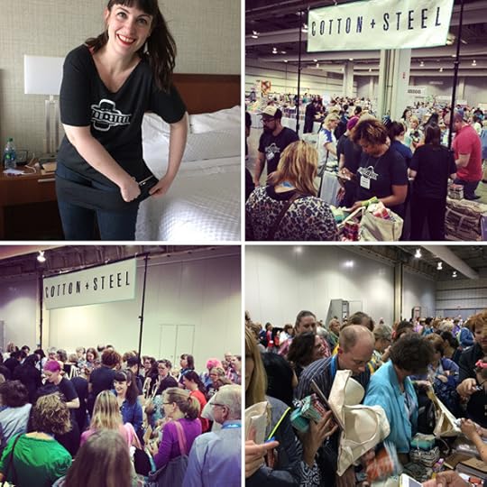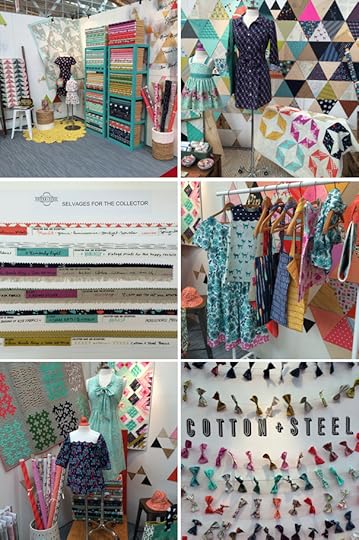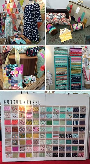 details of the pretty Cotton + Steel boothAfter the presentation, it was back to booth prep, and I helped with sewing buttons on garments in the booth, binding quilts, making throw pillows, and the like. I was so happy to help and even was given my very own Cotton + Steel T-shirt! Thanks ladies! After all of that, I got to help (and witness) for Sample Spree, an event I've only ever heard about. OMG, it lived up to the madness hype and then some!
